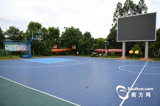 党群服务中心的另一个角色,是文体活动中心,其门前有一块标准篮球场,还配备了一个大型LED记分屏。记者走访期间正值中午,室外高温闷热,群众不适宜参与户外锻炼,所以没看见群众使用场地。工作人员介绍说,不少村里的村外的篮球比赛在这个球场展开,那时村里会非常热闹。