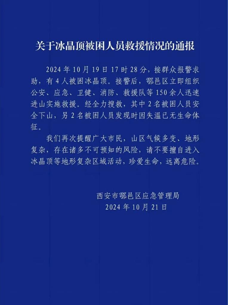 西安市鄠邑区应急管理局21日通报,两名被困冰晶顶的徒步者因失温不幸遇难。通报中说:“山区气候多变、地形复杂,存在诸多不可预知的风险,请不要擅自进入冰晶顶等地形复杂区域活动,珍爱生命,远离危险。”