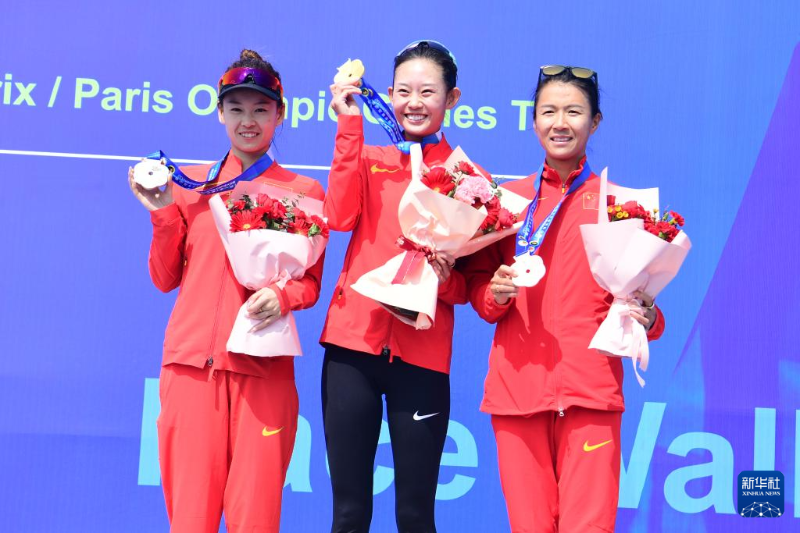 包揽女子20公里竞走冠亚季军的中国选手马振霞(中)、杨家玉(左)和刘虹在颁奖仪式上(图/新华社)