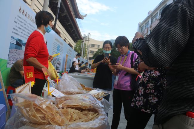 精美的展览有不少人驻足观看,隔壁的农副(海)产品和美食一条街同样火爆。海石花、牛肉丸、花生糖、朥饼等潮汕特色小吃摊位整齐干净,摊主不厌其烦地向过往群众介绍其特色小吃。其中,海石花是用海里的一种藻类——石花菜熬制而成的。石花菜又名海冻菜,是红藻的一种,主要分布在台湾海峡、海南以及西沙群岛等海域,南澳岛的海域也出产石花菜。这种食物富含胶质,外观晶莹,口感爽滑,堪称是来自海洋的天然凉粉。