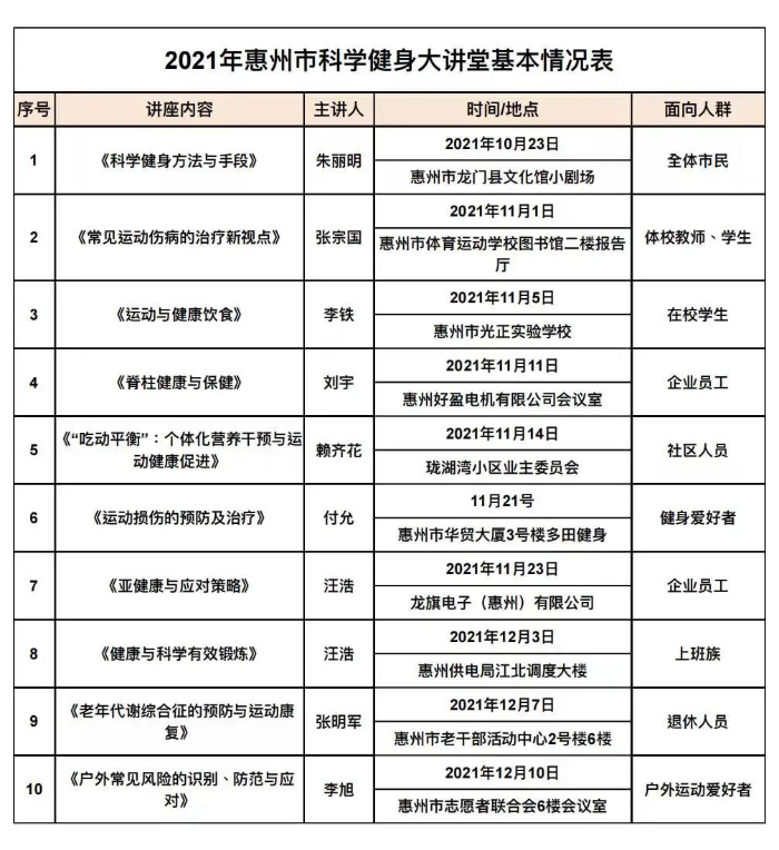 为深入贯彻落实《全民健身计划(2021-2025年)》和《广东省全民健身条例》,向全社会群众普及科学健身的知识,推动惠州市全民健身公共服务体系更加完善,结合“我为群众办实事”教育实践活动,惠州市文化广电旅游情色小说 于2021年10月-12月期间通过线上线下相结合的形式开展了十场科学健身大讲堂。邀请省市内知名体育健身教授、医院医生讲师,走进社区、企业、学校、有关协会等,为群众讲授科学健身知识。