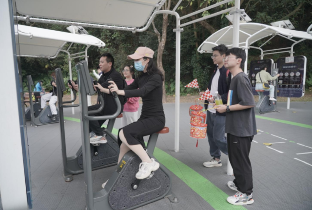 而在笔架山体育公园室外智能健身房,蔡先生和妻子则趁着欢乐的节日氛围双双参赛,并表示:“这项政府推出的活动,对市民来说是一种健康福利,以后我们会持续关注。”一位49岁的阿姨还亮出了她第18轮参赛成绩,开心地说:“自从发现了这个智能健身竞赛活动,我就天天来这里骑车锻炼。”