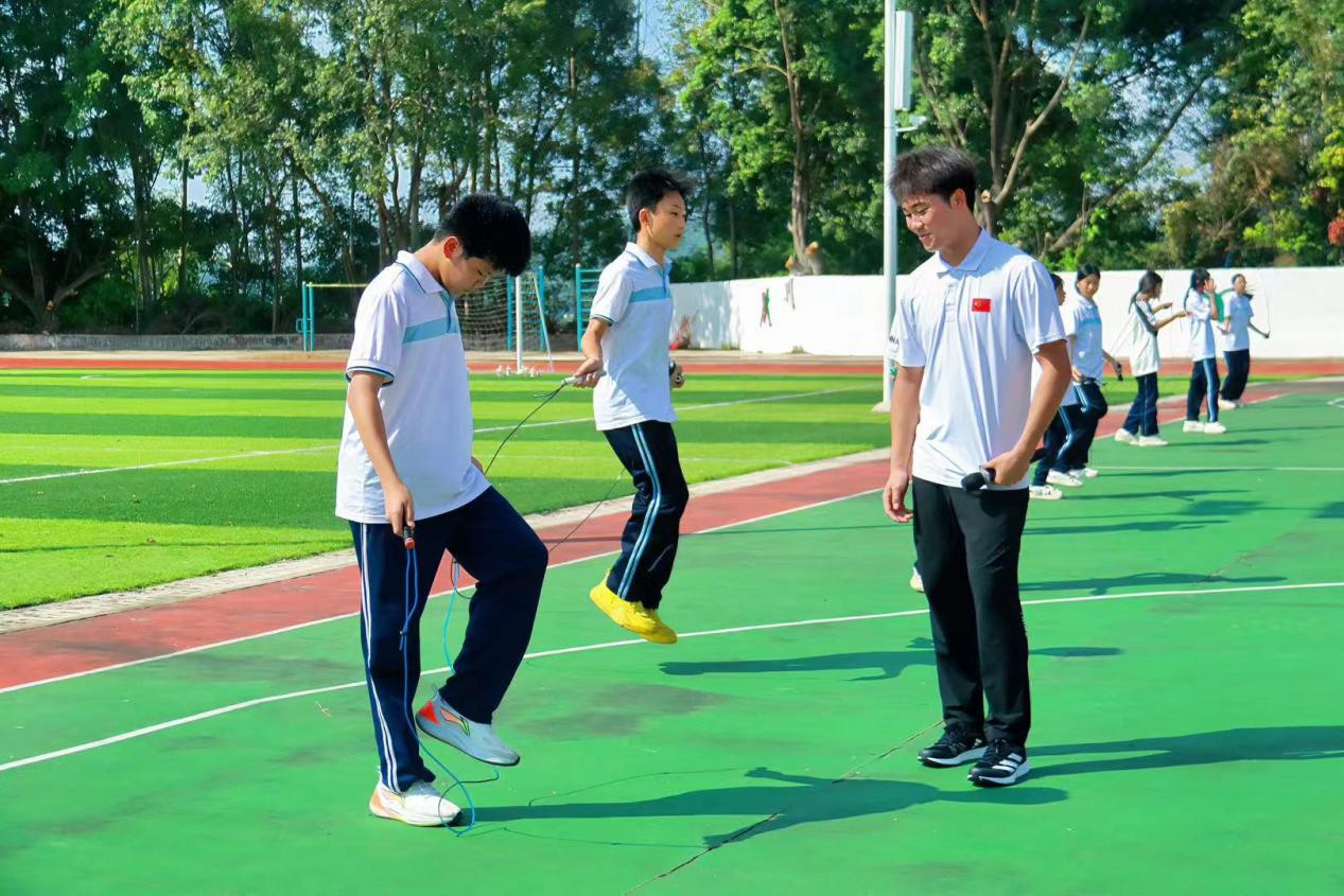 最后,“绿动青春——我要上全运”火炬传递活动开启,胡明海与学生们一起高举该校学生设计制作的“喜迎十五运”主题手工火炬,传递绿色低碳环保理念与体育运动精神。此外,本次活动还邀请广东省相关专业团队利用AI科技设备为同学们开展体姿改善、体适能水平等体质健康检测,更邀请吉尼斯世界纪录保持者、跳绳教练谢凯宇和江嘉煜为该校100名学生带来40分钟的公益课。