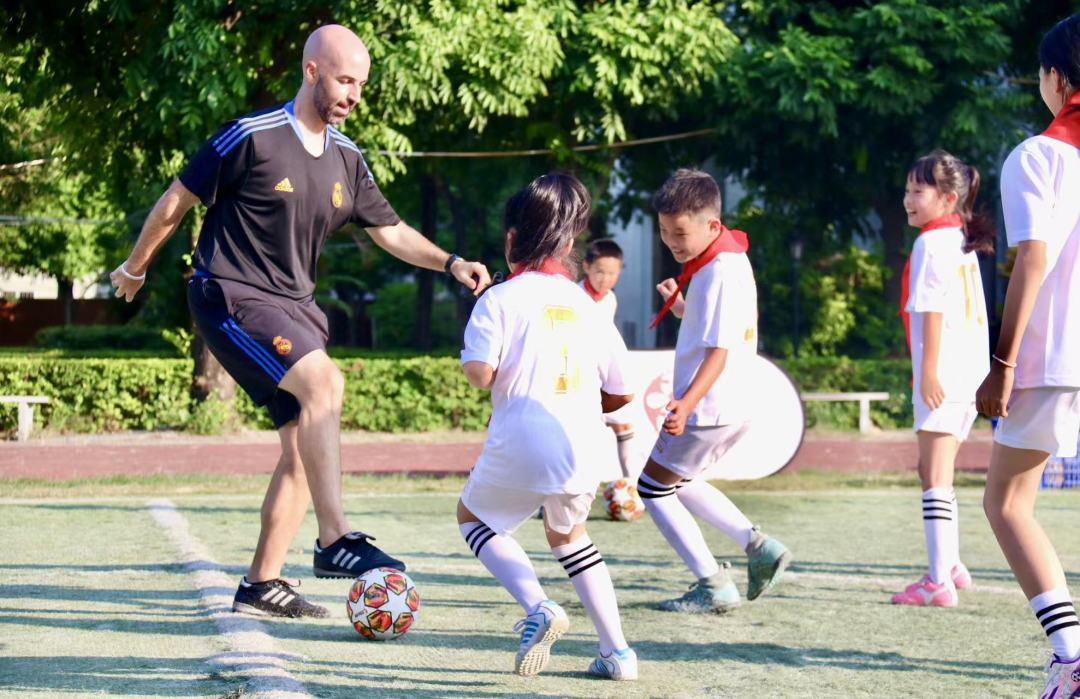 最后举行的冠军课堂的一大亮点是皇马足球先生,欧足联职业级教练员哈梅·胡安那斯为学生带来足球公益课堂。胡安那斯是皇家马德里基金会中国训练营华东地区主教练,曾获西班牙丙级联赛年度最佳教练员,丰富的执教经验涵盖了从足球启蒙阶段到职业水平的球员,作为基金会教练员及球员培训的主讲师之一,其主讲的训练营线上培训课程惠及多个省市的校园足球基层教练员和老师。