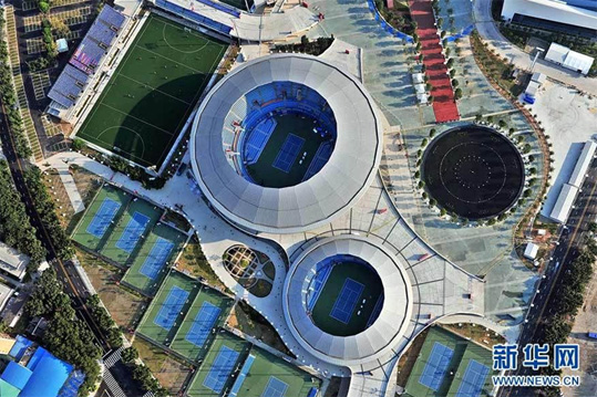 奥体网球中心主馆和副馆在设计上最鲜明的特点是与周边建筑、环境相协调,整个网球中心的设计不仅在使用功能方面完全满足比赛的要求,体量造型也是对主场馆飘带设计构思的延续和创新,彰显了“岭南风格,广东特色”,整个建筑的外观犹如客家围屋,而流线型的具有金属质感的材料,又有点像飞碟。