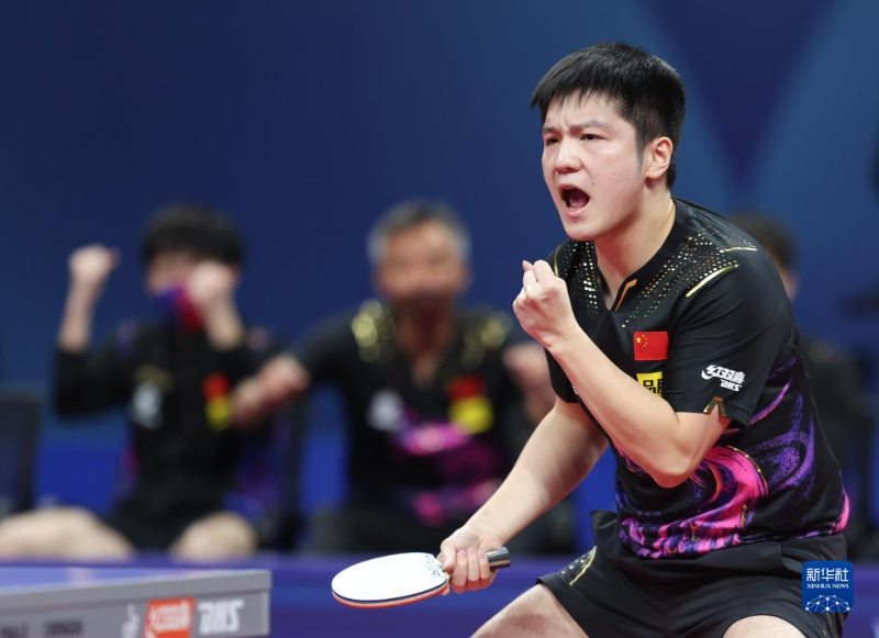 10月9日,中国队选手樊振东在比赛中庆祝得分,他以3比0战胜德国队选手贝内迪克特·杜达。新华社记者江宏景 摄