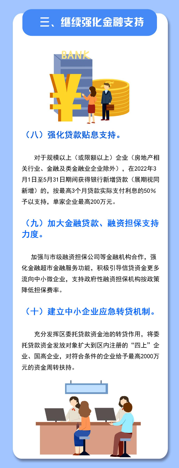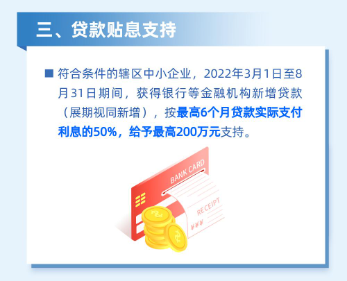 8.金融助力中小微企业发展,降低企业融资成本,对南山区中小微企业在2022年2月16日至4月30日期间(以发放贷款时间为准),获得银行等金融机构贷款(含展期)的,按实际支付利息最高50%给予贴息支持,贴息期限不超过3个月,每家企业不超过50万元。(责任单位:区金融发展服务中心)