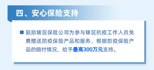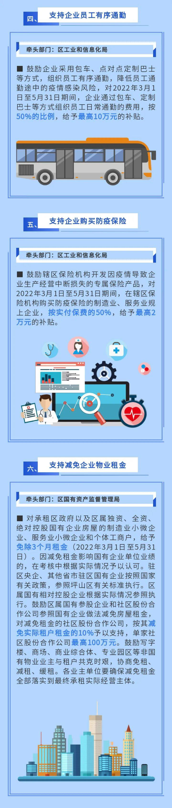实施防疫保险补贴。对2022年3月1日至5月31日期间,购买防疫保险产品和服务的企业,按照实付保费的50%予以支持,单家企业最高5万元。(牵头单位:区金融工作局)