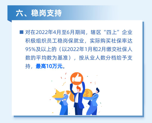 鼓励企业稳岗留工。对区四类百强企业坚持不裁员或少裁员的(2022年3-5月平均缴交失业保险人数不低于2022年1月的95%),按2022年3月实际缴纳失业保险人数给予500元/人的补贴,单家企业最高20万元。(牵头单位:区人力资源局)