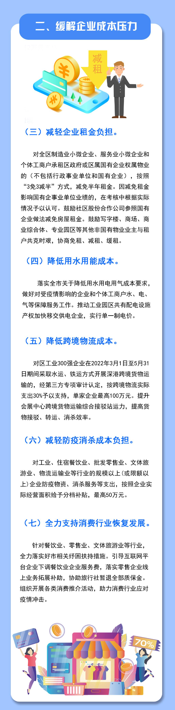 降低企业担保费用。对2022年3月1日至5月31日期间,申请本区担保机构信用担保的企业,按实际支付担保费的50%予以支持,单家企业最高50万元。(牵头单位:区金融工作局)