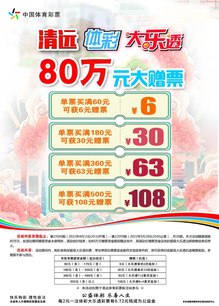 为回馈清远购彩者对超级大乐透游戏的支持,清远体彩即日起开展80万元赠票活动,活动对应期数为第22040期(2022年4月11日20:10开售)—第22059期(2022年5月28日20:00止售),共20期。该活动仅限清远体彩实体店参与,多期票不参与本次活动。