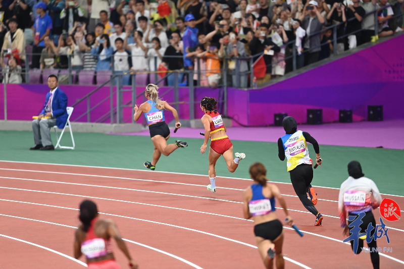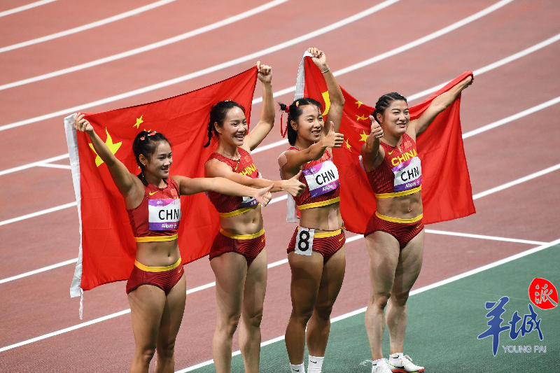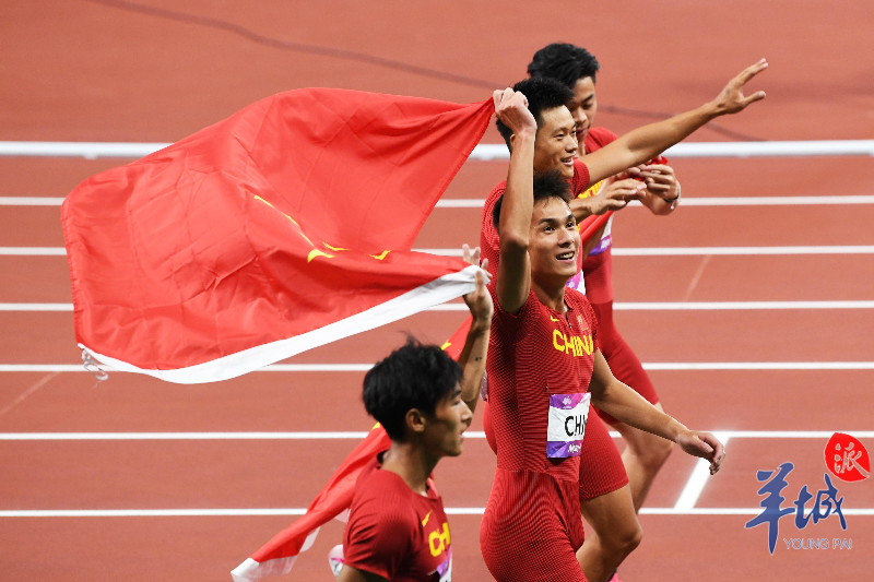 10月3日,杭州奥体中心的田径场上演热血沸腾的一幕,当晚压轴大战男女4×100米接力赛,中国军团演绎中国速度。由广东选手陈冠锋、严海滨和队友谢震业、陈佳鹏组成的中国男子接力队以38秒29的赛季最佳成绩夺冠,由广东选手梁小静与队友韦永丽、袁琦琦和葛曼棋组成的中国女子接力队以43秒39的成绩摘得金牌。