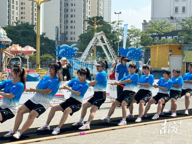 潮州鼓槌闻讯起,醒狮翻腾舞祥瑞,伴随着醒狮队点燃现场的氛围,时间很快来到上午9时30分,随着一声清脆的哨响,比赛正式拉开帷幕,只见赛场两边的队员们身体下沉,双脚紧扣地面,双手紧紧攥住粗壮的麻绳,手臂的青筋因用力而绷起。队伍前排的队员咬紧牙关,汗珠顺着脸颊滑落;而压阵的“锚人”身体后仰、腰带紧扣绳索,宛如定海神针般稳固。观众的助威声此起彼伏,呐喊声、加油声汇聚成一股巨大的声浪,将现场气氛推向高潮。