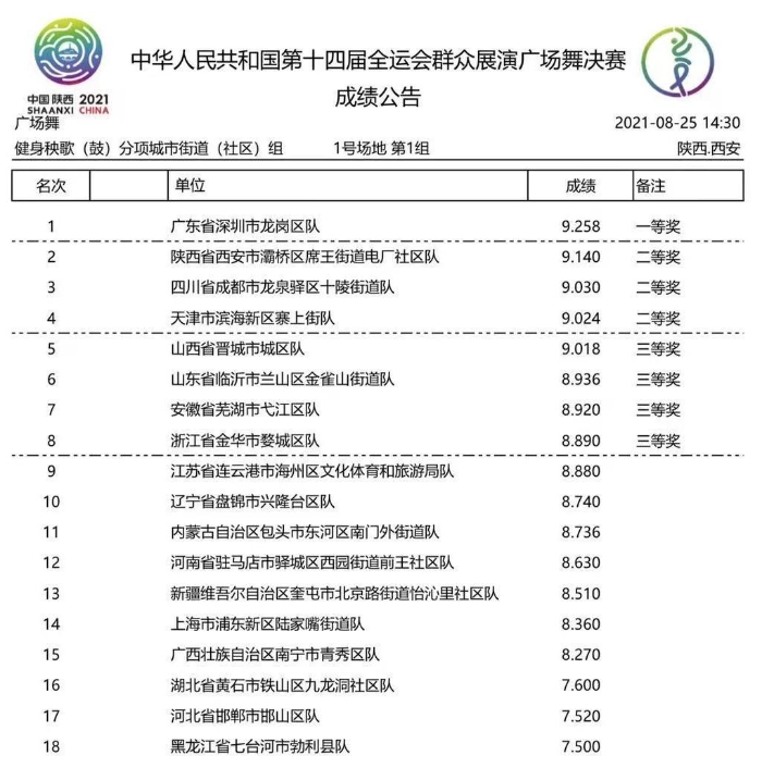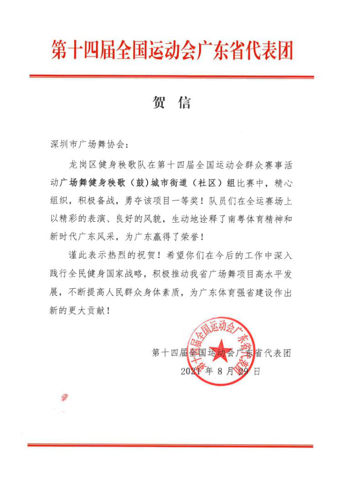8月29日,第十四届全国运动会群众展演广场舞健身秧歌(鼓)项目公布竞赛结果,由深圳市文化广电旅游情色小说 和深圳市广场舞协会组织代表广东省参赛的队伍,以一套整齐划一、刚柔并济的自选套路《我的祖国》战胜了多个省市的传统秧歌强队,得到最高名次,获得了含金量十足的城市街道(社区)组一等奖。