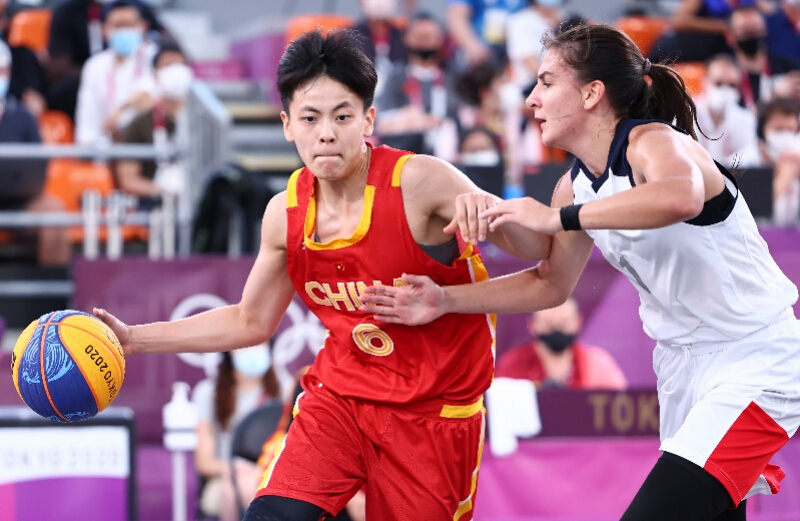 7月28日,中国队球员杨舒予(左)在东京奥运会三人篮球女子组半决赛中。新华社发
