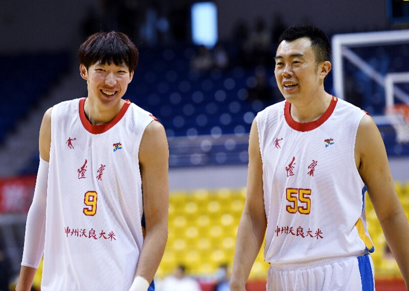 5月10日,辽宁队球员周琦(左)与队友韩德君在赛前交流。当日,在第十四届全国运动会男子U22篮球资格赛(山东烟台赛区)比赛中,辽宁队以114比73战胜湖南队。新华社发