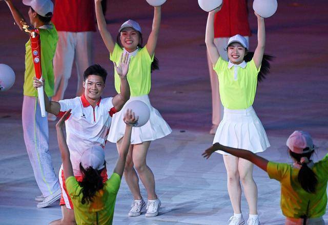 他把火炬传递给奥运冠军张雨霏,火炬再经过秦凯、郭文珺、马龙、杨倩这几位奥运冠军的依次传递,由杨倩点燃主火炬“复兴之火”,第十四届全运会拉开序幕。
