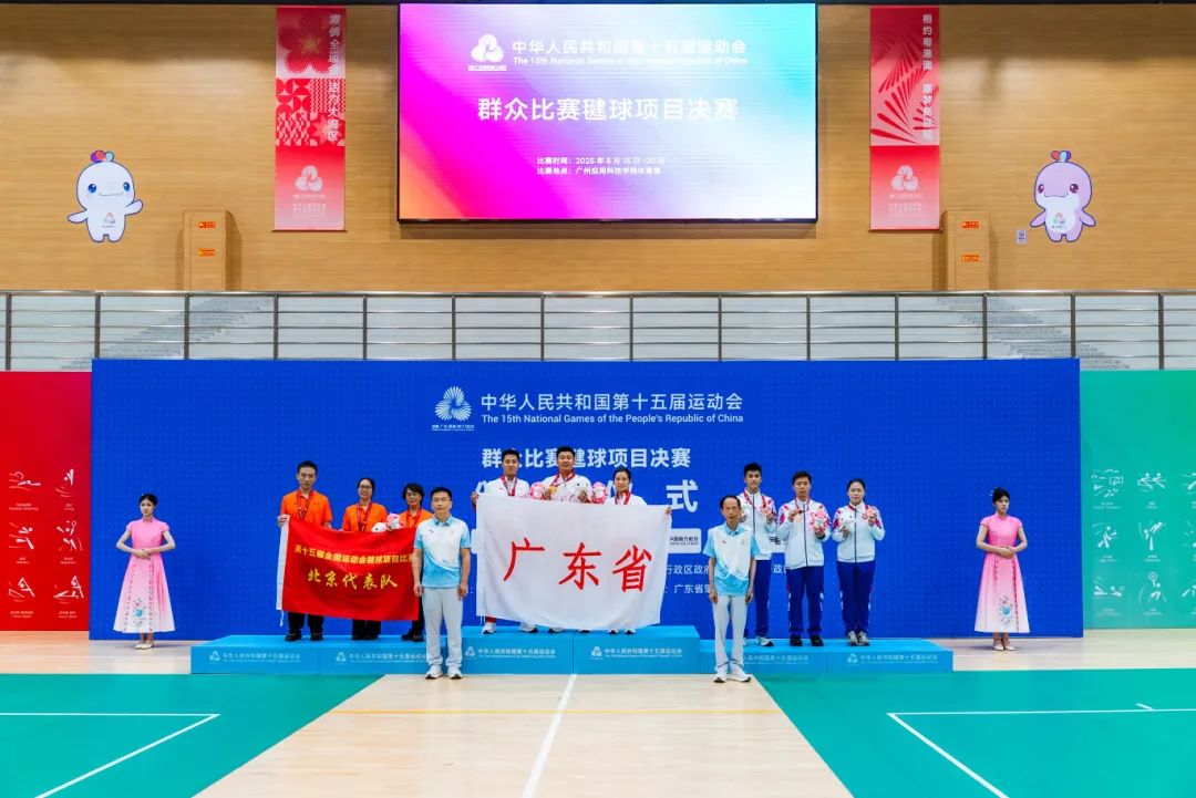 在8月17日进行的十五运会群众比赛毽球项目决赛4X30秒混合团体接力计数赛中,广东队以161次的成绩夺金并刷新全国纪录。
