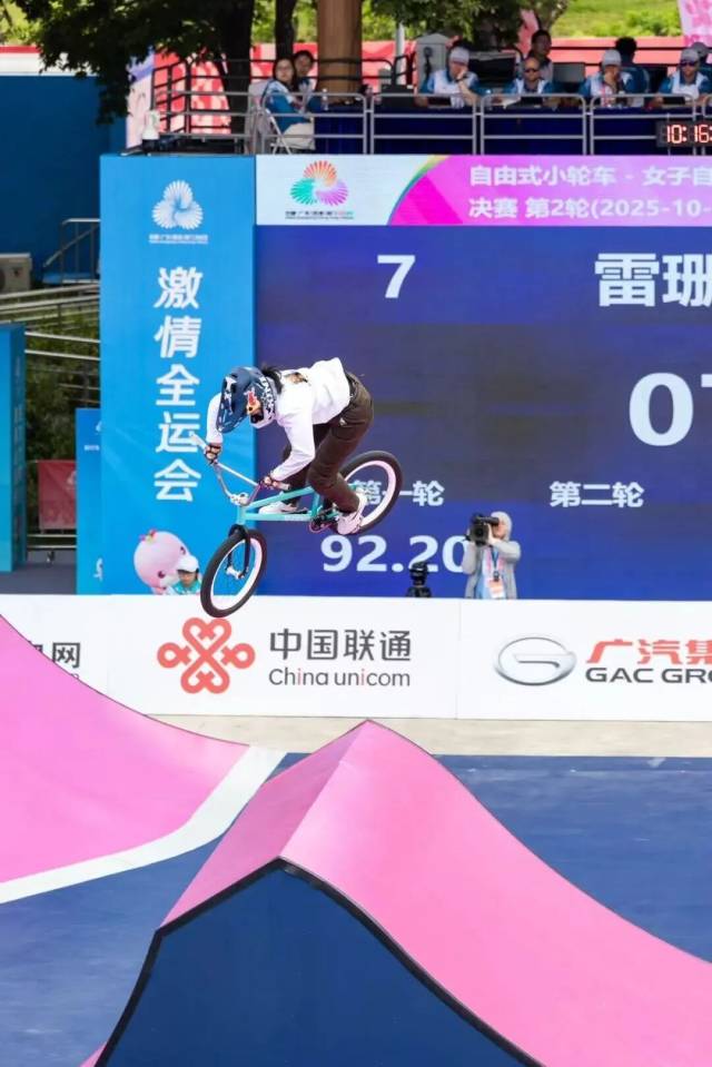 10月25日上午,第十五届全国运动会自行车(自由式小轮车)项目决赛在深圳市光明区虹桥公园收官。广东队范晓桐与雷珊珊两位选手分别以92.40分、92.20分斩获银牌与铜牌。