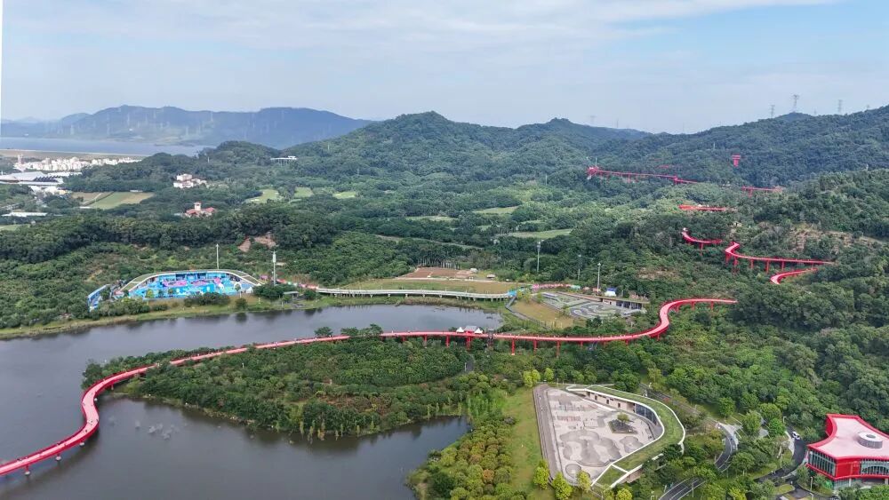 ↑深圳市光明区虹桥公园(10月25日摄,无人机照片)。全运会自由式小轮车比赛在这里举行。新华社记者 梁旭 摄