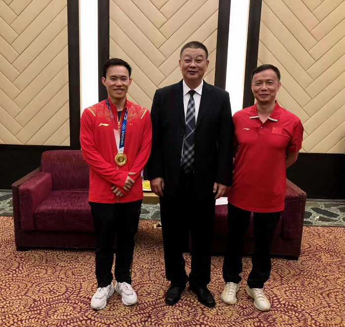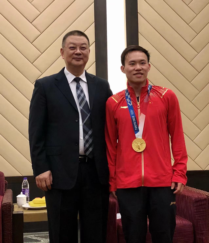 东京奥运双金得主、广东跳水名将谢思埸激动地摘下了自己的奥运会金牌,挂在了中山大学孙逸仙纪念医院运动医学科主任李卫平教授的脖子上。