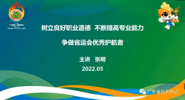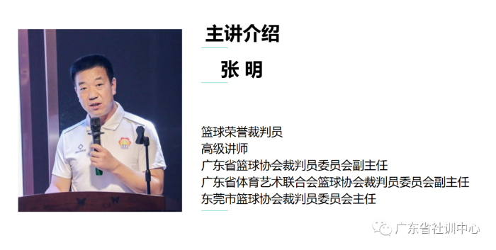 广东省篮球协会裁判员委员会副主任张明以篮球裁判为例,结合当前时代大背景,在《体育竞赛裁判员职业道德》公共课程上与学员们分享交流一名合格的篮球裁判员应具备的职业道德、个人修养和专业能力。通过分享,鼓励学员树立良好职业道德 ,不断提高专业能力,争做省运会优秀护航者。