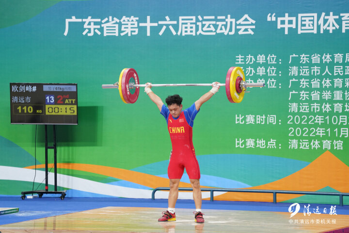 当天,清远选手欧剑峰在男子丙组61公斤级赛事上以抓举110公斤、挺举130公斤、总成绩240公斤,领先亚军22公斤的优势夺冠。