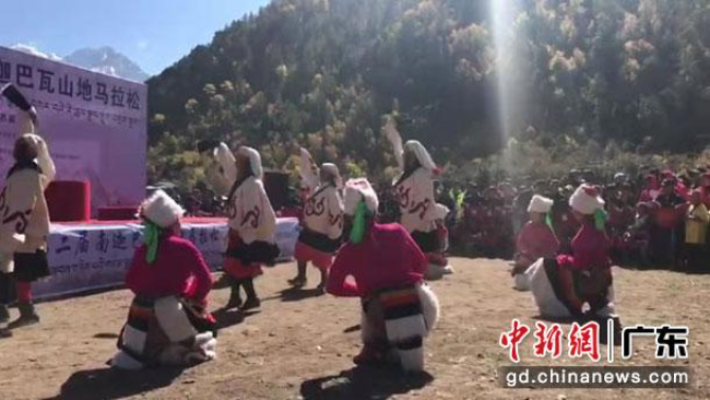 作为该次比赛的一个环节,在赛事的终点南迦巴瓦山雪峰下,举行了赛事的颁奖仪式,藏族姑娘达琼卓玛所在的林芝市米林县艺术团,在颁奖仪式上进行了热身歌舞表演。