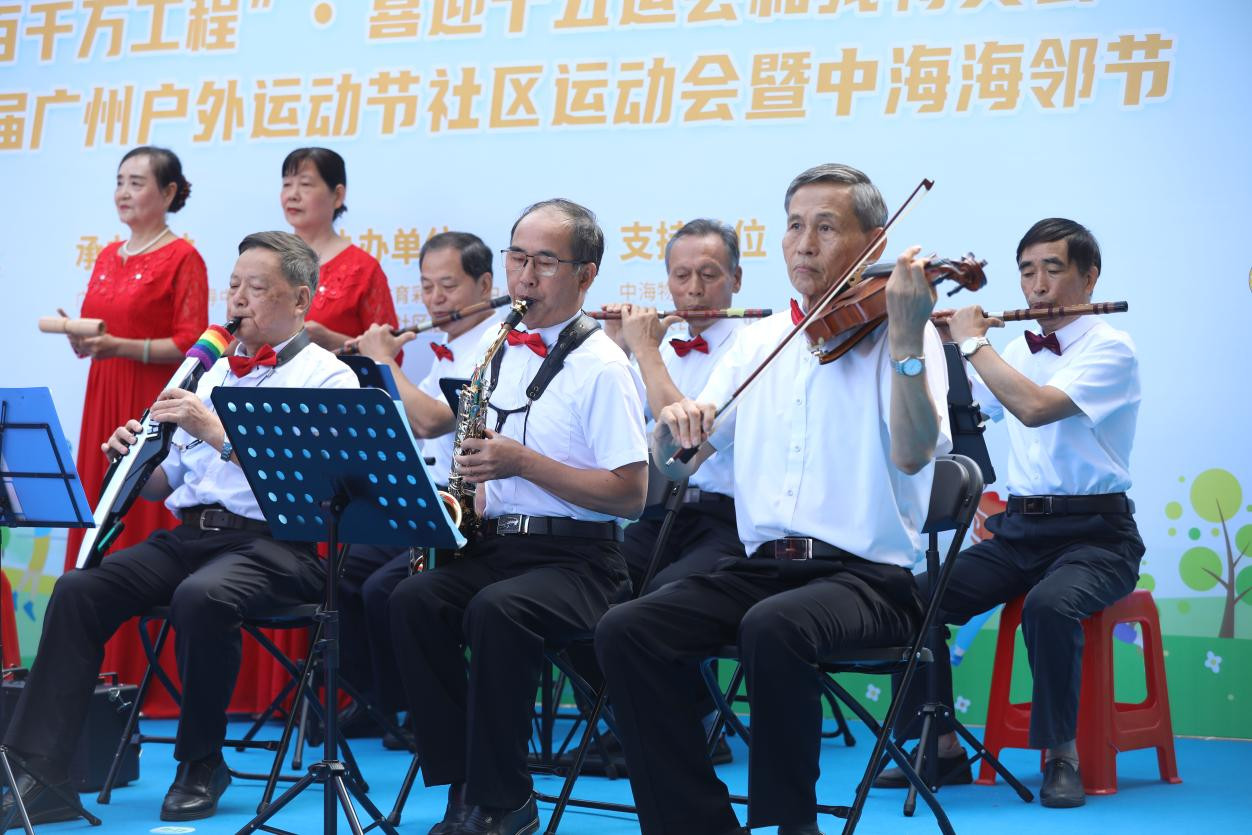 这是广州户外运动节社区运动会系列活动时隔5年后重回中海誉东社区。社区居民自发组织了多达10个表演节目为社区运动会助兴。少年们带来的摇滚乐与乐龄人士带来的国乐交响合奏、歌舞表演共同绘出一幅社区联谊大会的和谐画面,搭建起一个促进社区融合的平台,现场其乐融融,充满了欢声笑语。