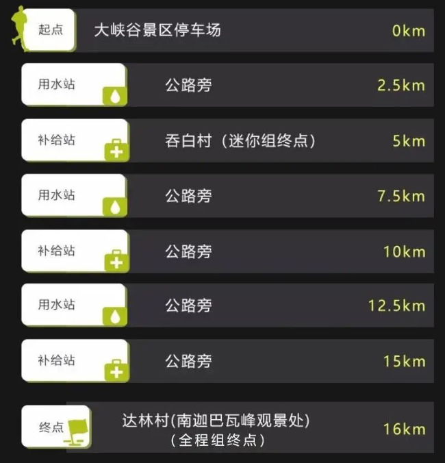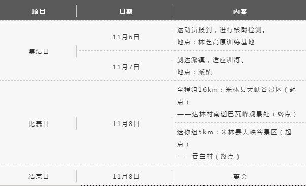 赛道详细信息 备注:第二届南迦巴瓦山地马拉松赛主要由水泥路构成,路宽约6米,全程缓上坡、缓下坡路段错落交织,参加选手应注意佩戴好护膝等护具;比赛道路是该路段汽车通行的唯一路段,考虑到比赛期间汽车通行会对选手造成影响,赛事保障我们将会采取服务点+机动摩托车应急+收容车收尾的保障形式进行,比赛开赛后,如不是发生不可抗力的突发事件需要紧急调度汽车进行处理,一律不允许汽车进入赛道。 参赛资格 1)参赛运动员需完赛半程马拉松或20公里(及以上)越野赛事,报名时需提交完赛证书以便审核。 2)因高海拔赛事,参赛运动员年龄限制男子18-48周岁,女子18-45周岁,部分高原本地选手经组委会特别批准可适当放宽年龄限制。 报名费用 报名费200元(含1106-1108食宿) 参赛规则 ■规则1 本届南迦巴瓦山地马拉松比赛全程组在前,迷你组在后,一次鸣枪同时起跑。 ■ 规则2 关门点和时间限制:为保障参赛运动员的比赛安全、顺利,比赛期间比赛路线设关门时间,限时进行交通封闭,起跑至关门时间后,各路段恢复正常交通。在规定的关门时间内,未完赛的运动员须立即停止比赛,退出赛道,以免发生危险。退出赛道的运动员可乘坐组委会提供的收容车到达终点处(如发生特殊情况,组委会有权决定提前结束比赛,运动员必须服从)。 ■ 规则3 组委会将会对起点、终点及关键路段进行监控,出现以下违反比赛规定的运动员将会取消比赛成绩,并追究其责任,在比赛中,因运动员利用虚假信息获取参赛资格或者报名后由他人代跑等原因所发生的一切责任后果,均由运动员本人承担,在比赛的过程中,出现争议或者其他特殊情况,则由裁判组决定。 ■ 规则4 参加马拉松比赛的运动员须按照规定的存放点存放个人物品,贵重物品不要存放在包内。运动员可以在完成比赛后14:00前到指定存放地点领取个人物品。如超过领取时间没有领取,可于第二天到赛事组委会领取,如5日之内不领取,组委会将会按照无人领取处理。 ■ 规则5 组委会沿马拉松路线每5公里设置补给点(含医疗点、补给点、流动厕所),每2.5公里设置用水站。每个服务点前50米会有明显标记,运动员可根据实际情况自行选择。 ■ 规则6 运动员至少提前30分钟完成参赛检录工作。 ■ 规则7 所有运动员比赛时可根据自身情况选择佩带护膝等护具。 ■ 规则8 所有运动员应充分认识运动潜在的危险,并根据竞赛规程的要求购买保险,自行承担赛事风险,没有购买保险的运动员不得参赛。正确审视自身身体状况,提前锻炼使自身能够适应比赛的强度(含高血压、心脏病、心脑血管疾病等不能参加该比赛)。 ■ 规则9 所有运动员在比赛中必须保持公平、公正的竞赛精神,遵守比赛规则,注意安全,不做可能引起自己或他人受伤害的冒险或有意行为;对上述行为,组委会有权对其行为采取警告、禁止比赛、取消成绩等措施,对上述行为引起的一切责任与后果均由违规者承担并取消比赛成绩。 赛事奖励 本次赛事将对全程组16公里男女前二十名选手进行奖励,奖励如下: 保障团队 (一)疫情防控及医疗保障团队:本次比赛由林芝市市卫健委及医院医护人员组成疫情防控及医疗保障团队,制定疫情防控方案并组织开展防疫工作;在赛道上设置医疗点,保障参赛选手的生命安全。 (二)道路保障团队:为确保本次比赛的道路保障,林芝市特组织林芝公路分局、市交通运输局、米林县交通运市局等单位,在开赛前组织相关人员,对比赛道路进行路面清理及路面检修。 (三)安全保障团队:为确保本次比赛突发事件应急处理,林芝市特组织市公安局、市消防救援支队、市应急管理局、米林县公安局等单位,制定赛事突发事件应急处置方案,保障赛事的正常进行。 (四)食品安全保障团队:为确保本次比赛嘉宾、运动员、裁判员、工作人员的食品安全,林芝市特组织市市场监管局及米林县市场监管局等单位,制定赛事期间食品安全监督管理方案及应急预案,并组织实施。 其他 抗议与申诉 凡是对竞赛成绩、裁判员执裁、运动员参赛资格有异议并提出申诉者,需向组委会仲裁委员会提交书面申诉报告,仲裁委员会方可受理申诉并在5个工作日内反馈申诉结果。 保险 ● 本次比赛组委会将赠送所有参赛者人身意外险。 ● 参赛者如有其他保险需求,可自己购买其他险种保险。 西藏·林芝 奔跑雅鲁藏布,邂逅南迦巴瓦。随着西藏经济社会的不断发展,全民健身意识的不断提高,加之跑步这项简单运动的风靡,世界屋脊上的马拉松迎着所有人的期待应运而生。 此次赛事赛道位于4A级景区米林县雅鲁藏布大峡谷内,全程16公里。 线路:大峡谷景区停车场→→雅鲁藏布江桥→→吞白村→→隆比→→索松村→→达林村(南迦巴瓦峰观景处),中途最高海拔3200米。 跑步中,青蓝流淌的雅江水,层林尽染的金秋山头,白雪皑皑的南迦巴瓦尽收眼底;途中的悬崖峭壁,森林草甸,五色经幡也将带来不一样的喜马拉雅体验。 相关问题解答 请问200块报名费包三天食宿吗? 选手只要承担外地到林芝的往返交通费用。当然,赛前赛后要留在西藏旅游费用也是自行承担。 请问核酸检测费用是自理吗? 核酸检测费用由组委会统一承担。 选手住宿情况如何呢? 我们的参赛选手按照同性别2人一间安排住宿,有需要特殊安排的赛前请报组委会。均为宾馆独立标准间。 请问要飞到哪里? 可以飞到林芝市米