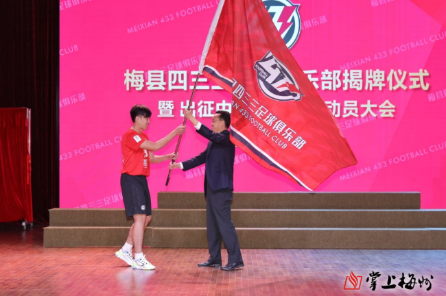 中国足协执委、梅州市市长张爱军为球队出征授旗
