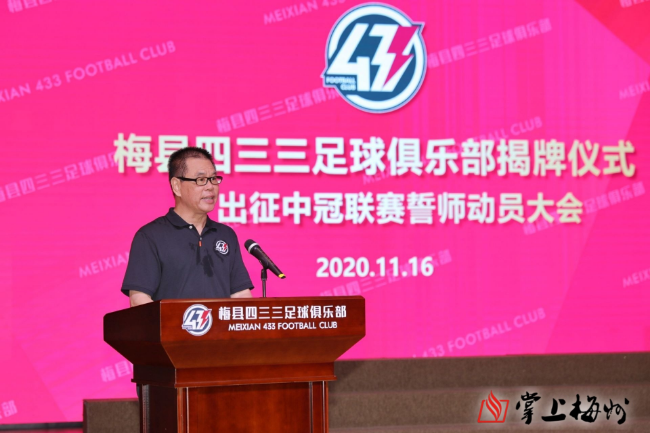 11月16日,梅县四三三足球俱乐部在梅县区雁洋富力足球学校举行揭牌仪式,并誓师出征中冠联赛。广东省足协主席叶细权出席活动,中国足协执委、梅州市市长张爱军为球队出征授旗。