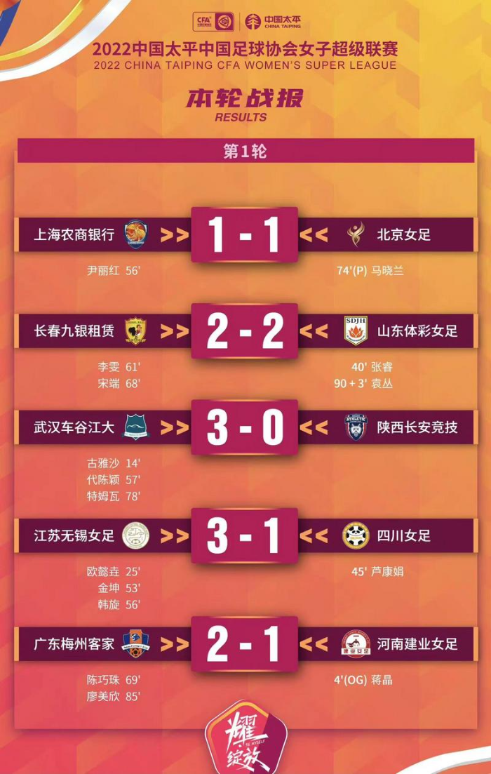 首轮比赛,除广东队外,卫冕冠军武汉队、江苏女足均获胜,山东队的张睿打进了新赛季女超的第一个进球,第2轮比赛将在4月11日进行,广东女足的对手将是山东队。