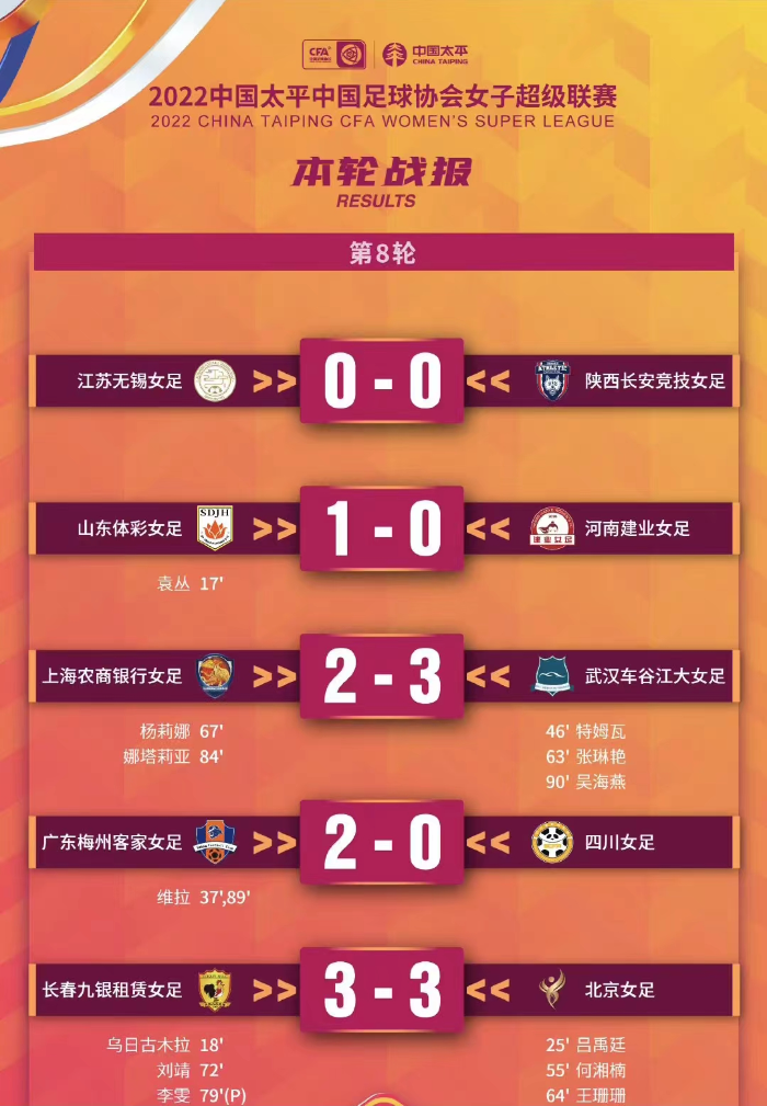 本轮其他比赛,“升班马”陕西队逼平了江苏队,而卫冕冠军武汉队凭借吴海燕在第90分钟的进球绝杀上海队。这样,新赛季8轮全胜的武汉队将榜首优势扩大到5分。目前,广东队积9分升至积分榜第7位,下一轮女超将在5月11日进行,广东女足的对手将是传统劲旅北京队。