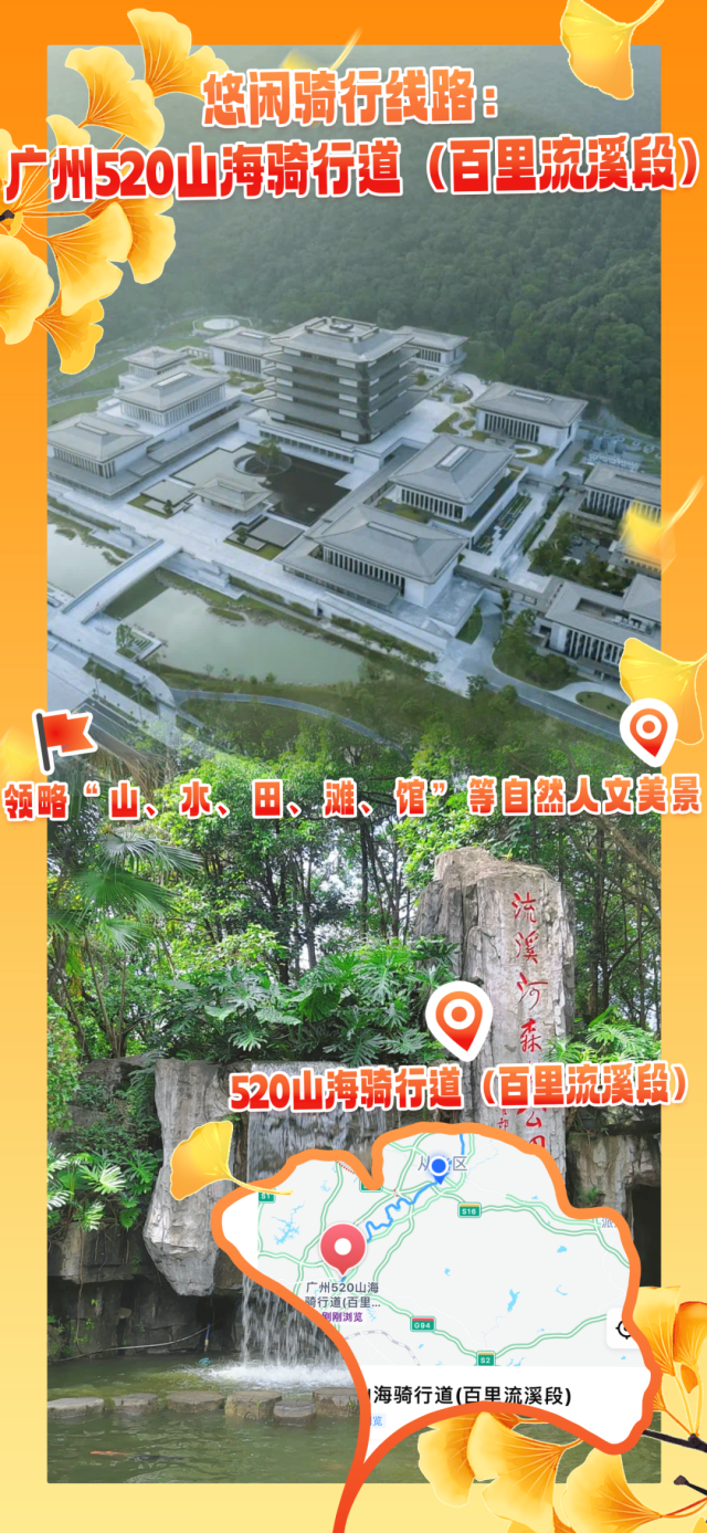 广州520山海骑行道(百里流溪段)在从化区内,始于太平镇,终于从化流溪河国家森林公园。沿流溪河畔骑行,可欣赏国家版本馆、温泉风景名胜区、米埗小镇、从都湿地公园、生态设计小镇等景点,领略“山、水、田、滩、馆”等自然人文美景,也可深入流溪河国家森林公园、石门国家森林公园、风云岭森林公园等天然氧吧,感受大自然的无穷魅力。