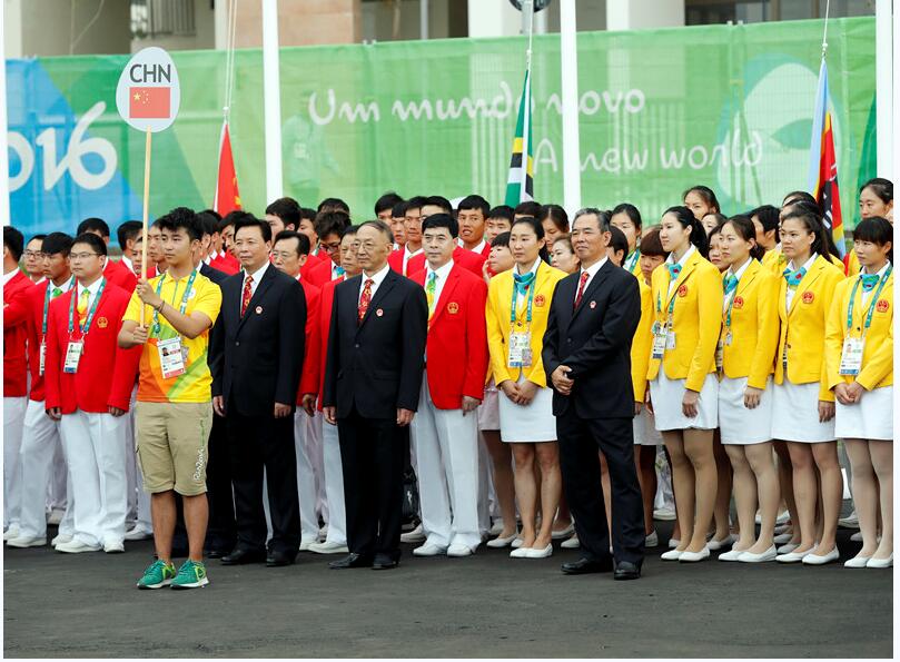 中国体育代表团的部分运动员、教练员和官员,在团长刘鹏、副团长杨树安、蔡振华的带领下,共同出席了今天的升旗仪式。中国驻里约总领事馆总领事宋扬也出席升旗仪式。