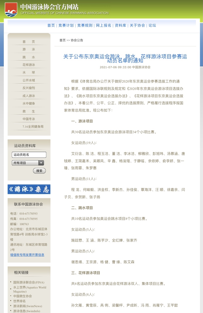 7月6日上午,中国游泳协会在官网发布了《关于公布东京奥运会游泳、跳水、花样游泳项目参赛运动员名单的通知》,公布了中国游泳队、中国跳水队和中国花样游泳队的东京奥运会参赛名单:30名运动员参加东京奥运会游泳项目34个小项比赛,10名运动员参加奥运会跳水项目8个小项比赛,8名运动员参加东京奥运会花样游泳双人、集体项目比赛。