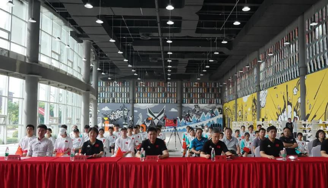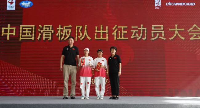 7月12日,滑板国家队出征动员大会在国家极限运动溧水训练基地举行,国家体育总局社体中心备战办主任杨曾秦、中国滑板队领队蔡永军出席动员大会。