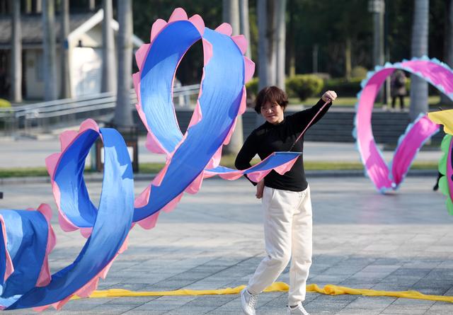 3月3日,在广西南宁市南湖边休闲场所,市民舞起彩绸健身娱乐。新华社记者陆波岸摄