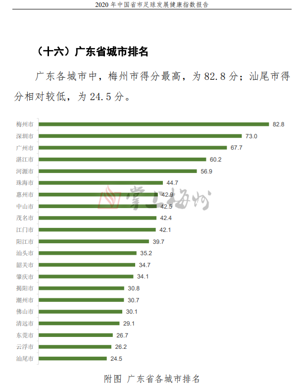 15日,中国足协发布《2020年中国省市足球发展健康指数报告》,报告指出,根据指标体系计算得出,百分制下,2020年中国省市足球发展健康指数城市排名,梅州市82.8分排名第一,其次是北京市和武汉市。前十还有大连市、深圳市、青岛市、南京市、成都市、眉山市、丽江市。