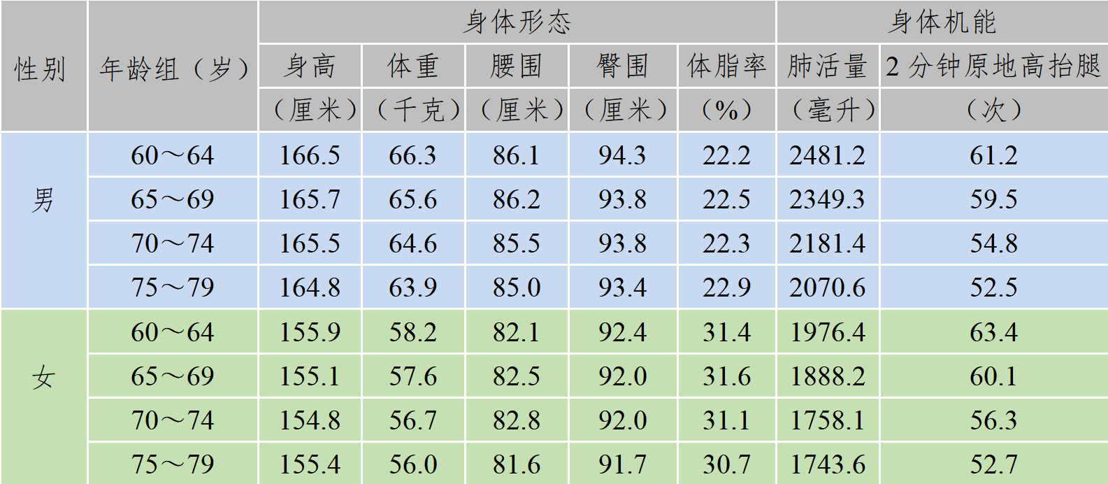 2024年广东省国民体质监测老年人各项体质指标平均数见表3。