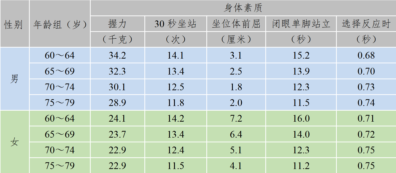 表3 2024年广东省国民体质监测老年人各项体质指标平均数