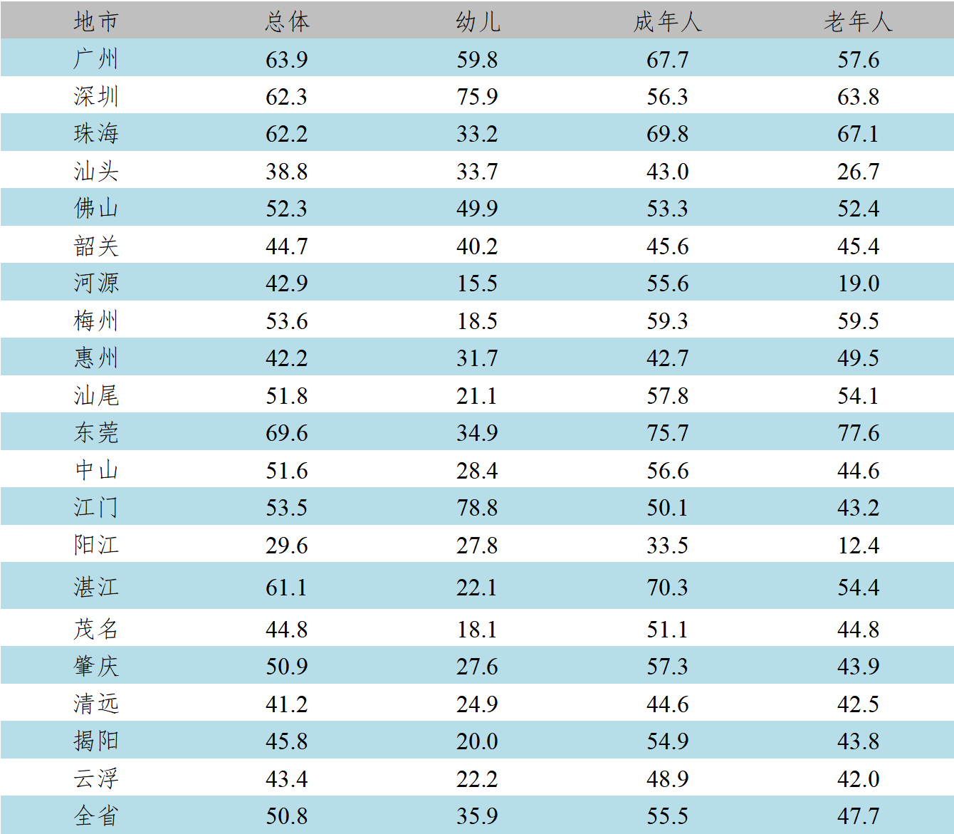2024年广东省各地市城乡居民体质达到良好及以上的人数百分比范围为29.6%~69.6%,其中幼儿为15.5%~78.8%;成年人为33.5%~75.7%;老年人为12.4%~77.6%(见表4)。