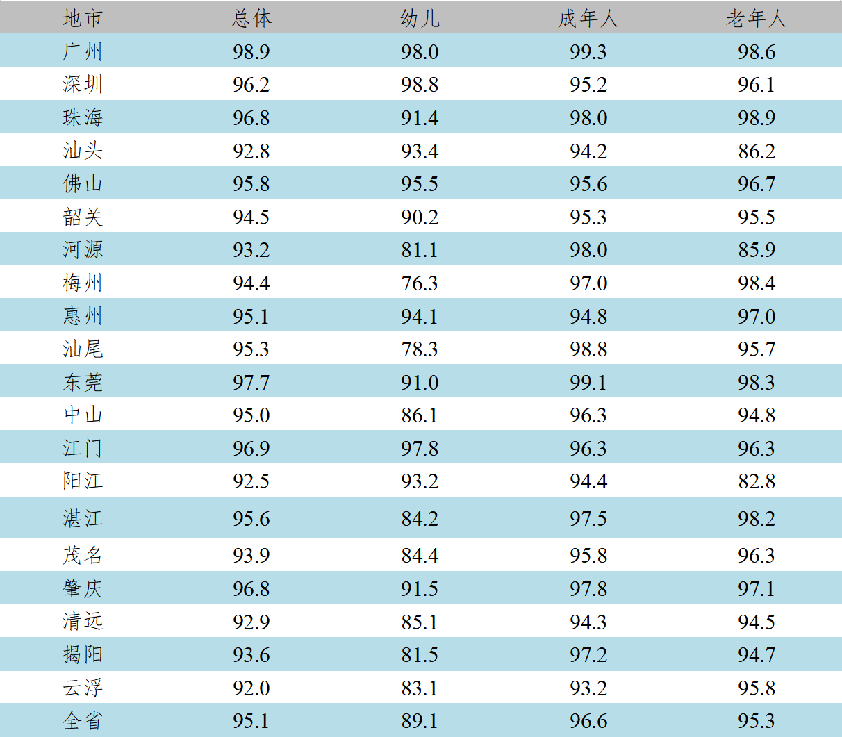 2024年广东省城乡居民体质合格率(国民体质水平达到合格等级及以上的人数百分比)为95.1%,其中幼儿为89.1%;成年人为96.6%(20~39岁成年人为96.2%,40~59岁成年人为97.0%);老年人为95.3%。男性为94.20%;女性为95.8%。乡村人群为94.1%;城市人群为95.6%。