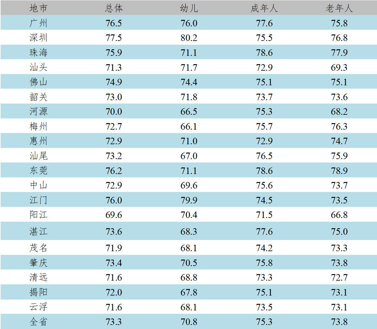 2024年广东省城乡居民体质综合平均得分为73.3分,其中幼儿为70.8分,成年人为75.3分,老年人为73.8分。各地市体质综合平均得分的范围为69.6~77.5分,其中幼儿为66.1~80.2分;成年人为71.5~78.6分;老年人为66.8~78.9分(见表6)。