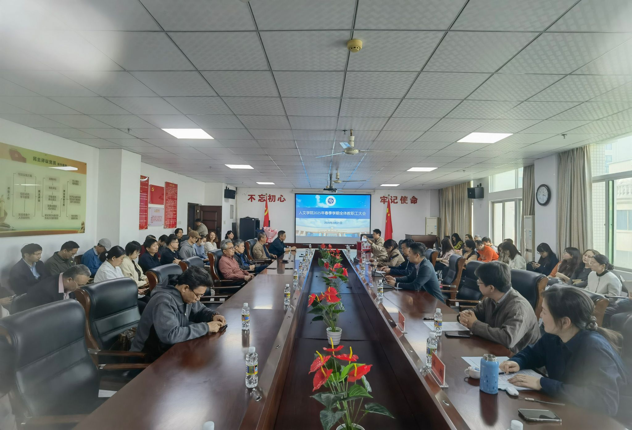 在社科楼B719会议室举行2025年春季学期教职工大会,院长谭新红,党委书记杨元广,副院长李彩霞、贾冬阳、章颜和全体教职工参加会议,会议由杨元广主持。