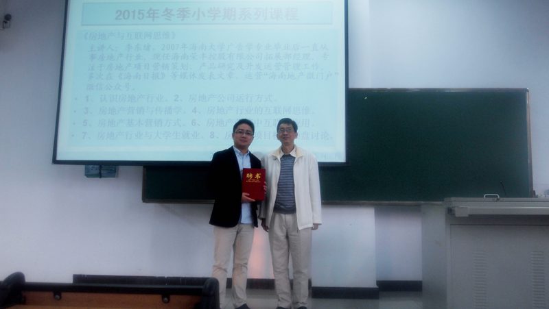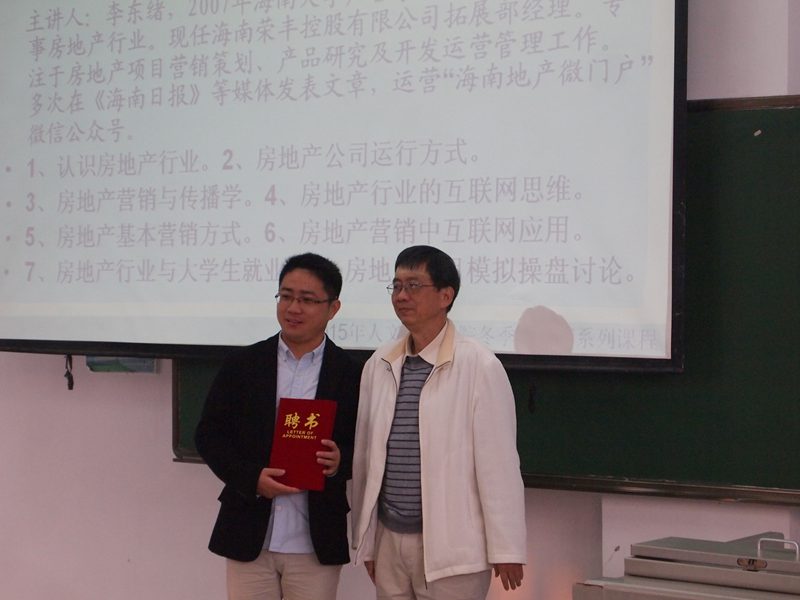 党委书记王肇庆老师为本期特聘专家——李东绪颁发聘书。 在第一日的讲座中,李东绪以“嫡系”学长的身份,为全体在场学弟学妹们讲述了自己从一个非“科班”人士到成为房地产公司拓展部经理的历程,激励全体同学,在日后的职业生涯中不断学习,刻苦努力。随后,李东绪学长简短精要的为大家描述了房地产业的前身与后世的展望,在把同学们引入职业思考的道路上后,李东绪学长详细讲解了“职业”与“职位”的关系,纠正了同学们的职业观。第二日的讲座中,李东绪学长,继续以房地产为最真实的案例,通过房地产实例,具体阐述了互联网思维的“独孤九剑”。帮助同学们培养起最新的互联网思维,取胜于职场。 本次冬季小学期第二期讲座,为我系同学提供了新的就业方向,更新了职业思考方向,引进了决胜之法。预祝我系冬季小学期第三季讲座更加精彩,圆满结束。 刘泊宁