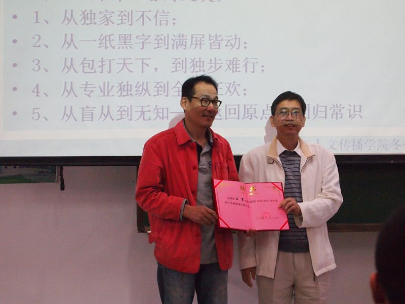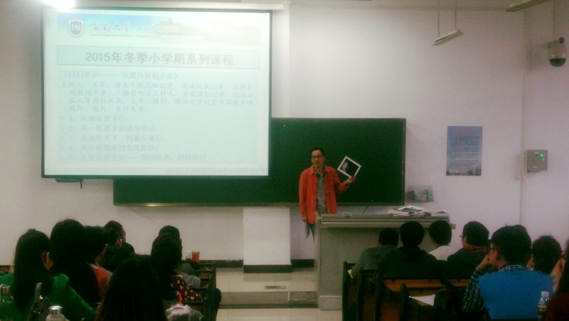 2015年1月8日上午八时,人文传播学院2012级新闻与传播学系冬季小学期正式开班。海南日报高级记者,具有35年媒体从业经验的王军老师走上讲台,为2012级新闻与传播学系同学们讲授了本届小学期首门课程《回归常识——从媒体接触开始》。人文传播学院党委书记王兆庆教授出席授课并致辞,新闻与传播学系主任何晶娇老师担任主持工作。 王军老师于宣传系统新闻干事、广播台电台主持人、省报摄影记者、媒体出品人等岗位从业,其文字、摄影、媒体运营创意作品获多项国际、国内、省内大奖,拥有丰富的理论和实践经验,深厚的专业背景。以一组“秀英儒显村百岁老人”的摄影图片为出发点,王军老师阐述了媒体信息采集时的目的性和咨询传播过程中传播者对受众的主动选择,深入浅出地指出个人在面对繁杂资讯时,要回归常识,避免被蒙蔽;媒体从业者传播信息时,也应充分尊重每个个体对信息的不同反应和不同声音。王军老师说:“相对于‘回望’表现出来的仪式感,‘回归’更能体现用‘常识’理解问题的理所当然。”随后,王军老师又以“如何向父母要零花钱”为例与同学们进行互动,生动鲜活地分析了一篇成功广告文案应当具备的要素。最后,同学们也就微信平台运营前景以及陕西手术台自拍事件向王军老师提问,并得到细致解答。 在短短三小时的交流活动中,王军老师渊博的学识、专业的解读和风趣幽默的谈吐使同学们获益匪浅。接下来的两周内,还将有情色小说