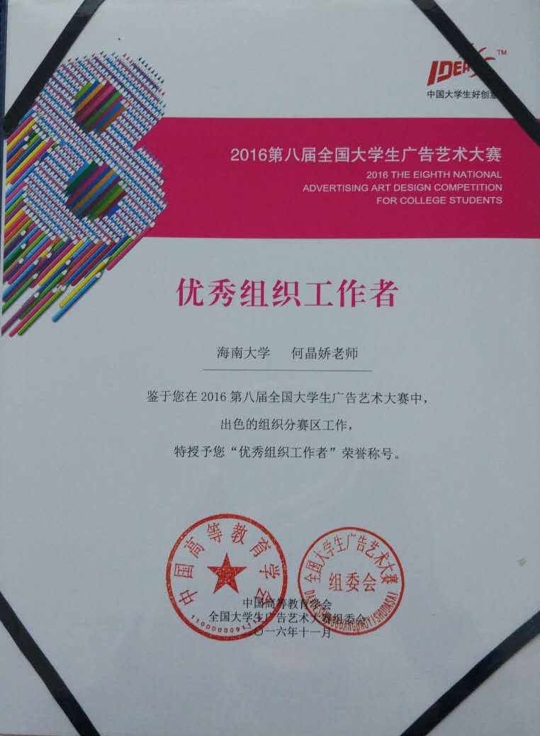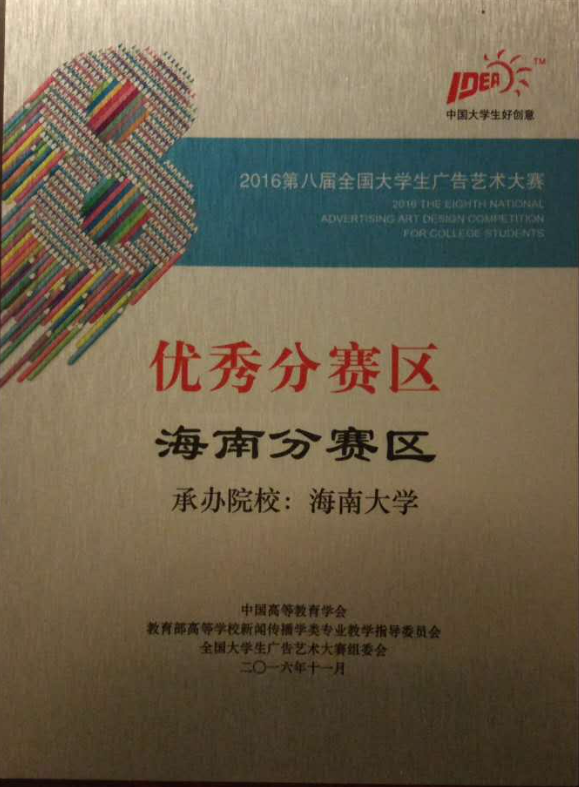 张玉杰同学在中国大学生广告艺术节学院奖获得包装类银奖、耿铎获学院奖文案类铜奖之后又一个大奖。人文传播学院何晶娇老师获得第八届大广赛“优秀组织工作者”荣誉称号,海南省教育厅荣获“优秀指导单位”奖,海南赛区荣获“优秀组织奖”。 全国大学生广告艺术大赛(简称“大广赛”)是由教育部高等教育司指导,教育部高等学校新闻传播学类专业教学指导委员会、中国高等教育学会广告教育专业委员会主办的全国高校文科大赛。据悉,本次“大广赛”共收到来自全国2311所高等院校作品共17.7万组,再创历史新高。为顺应市场变化和行业需求,此次“大广赛”新增设了营销创客类竞赛单元,要求参赛作品以校园作为市场进行营销实战,最终有104支团队参与该单元的奖项角逐。同时还增设了互动类单元,这是对新媒体时代新广告形式的有益探索,受到命题企业、教育界及行业专家的一致肯定。 “大广赛”海南分赛区自2015年成立以来捷报频传,去年新赛区成立伊始,就获得了全国一等奖1项和多项全国优秀奖。在刚刚落幕的第八届“大广赛”中获得全国奖项的还有:三亚学院文化与传媒学院广告系作品《哇哈哈激活∏》获得策划案类全国二等奖,海南经贸职业技术学院作品《急速闪充、急速指纹、3G内存》荣获平面类全国三等奖。另有海南热带海洋学院、海南师范大学等院校的参赛作品获得全国优秀奖共15项。 2016年,“大广赛”海南赛区竞赛被正式纳入海南省教育厅主办竞赛序列,情色小说
