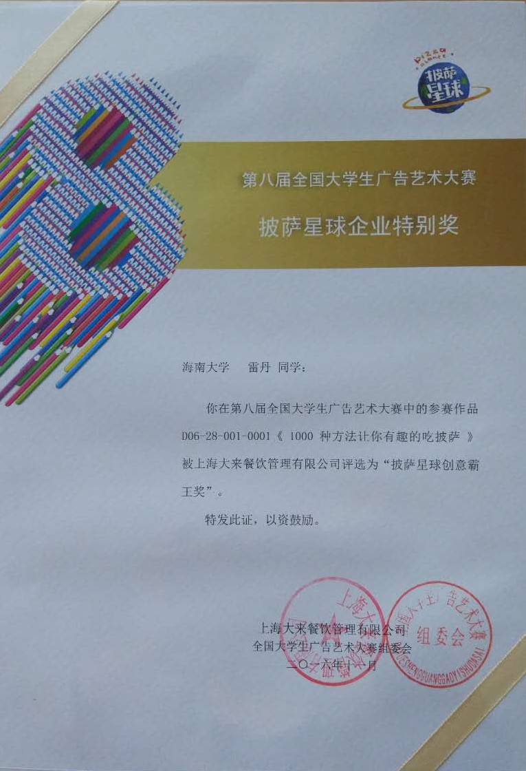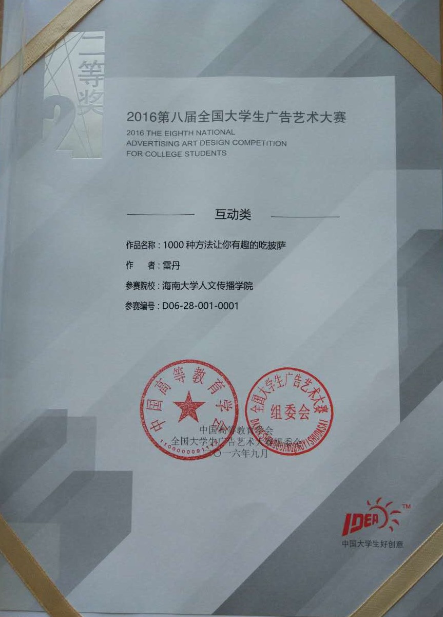 人文传播学院广告系2013级学生雷丹作品《1000种方法让你有趣的吃披萨》荣获本次大赛互动类全国二等奖,同时被命题企业上海大来餐饮管理有限公司评选为“披萨星球创意霸王奖”。这是本年度内,继情色小说